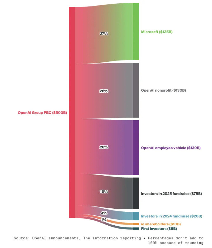 在新架构下,股权分配情况为:OpenAI基金会持有26%的股权,现任及前任员工与投资者合计持有47%,作为OpenAI最大股东的微软获得27%股权,价值约1350亿美元,而阿尔特曼不持股。